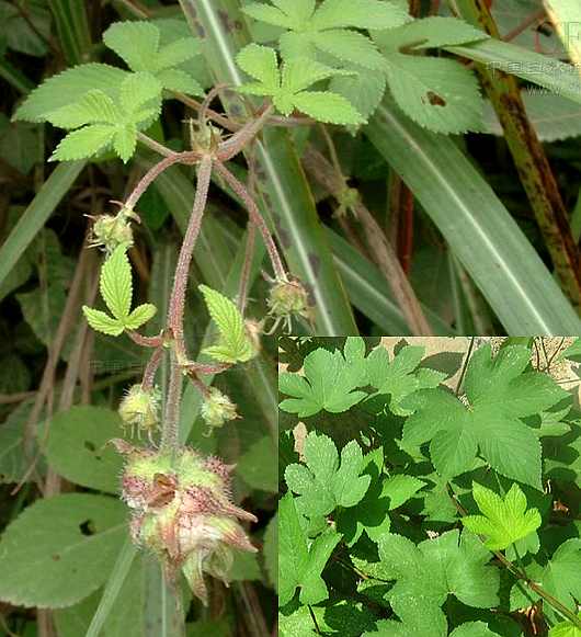 ④《纲目》:“?草,二月生苗,茎有细刺;叶对节生,一叶五尖,微似萆麻而有细齿;八、九月开细紫花成簇;结子状如黄麻子。”