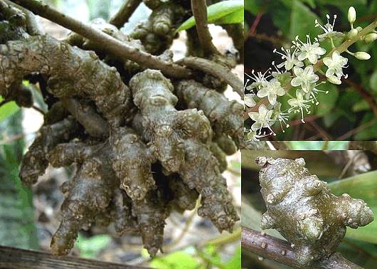 肉质小藤本。叶互生,肉质,卵圆形,长4~6厘米,宽4~5厘米,光滑无毛;叶柄短。叶腋生瘤块状珠芽,表面呈瘤状,绿色,直径约3~4厘米。长穗状花序腋生,长达20厘米,下垂;花小,绿色,花冠5瓣。全年可采。