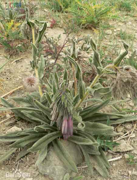 ②新藏假紫草:多年生草本,高25~35厘米,全株被白粗硬毛。根直生,略呈圆锥形,支根常数个扭转在一起。茎直立,单一或基部两歧,被长硬毛。根生叶丛生,无柄,叶片线状披针形,长约13厘米,先端急尖,基部渐狭,全缘,黄绿褐色;茎生叶互生,较短小,无柄。蝎尾状聚伞花序密集于茎顶,花两性;苞片线状披针形,具硬毛;花萼短筒状,裂片5狭窄叶状,与花冠等长或超出;花冠长筒形,紫色或淡紫色,长达1.5厘米,裂片5,椭圆形,外侧略被白毛,喉部与基部光滑;雄蕊5,花丝短或无;子房上位,花柱纤细,柱头球形,2深裂。小坚果阔卵形,淡褐色。花期6~7月,果期8~9月。