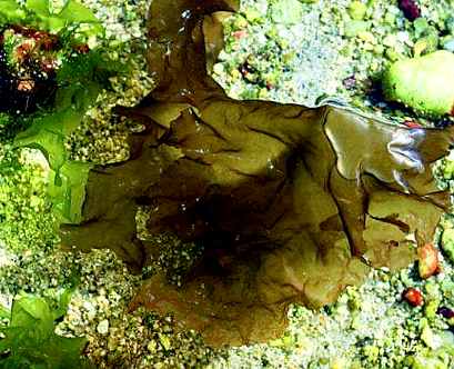 藻体为扁平叶状体,基部有盘状固着器。具短柄,由柄上生出的叶状体呈广披针形或椭圆形,一般长可达15~20厘米,宽10~16厘米,个别的长可达50厘米,宽可达30厘米。膜质,边缘波状;幼时浅粉红色,以后逐渐变为深紫色,衰老时转为浅紫黄色。生长期(叶状体)11月至次年5月。