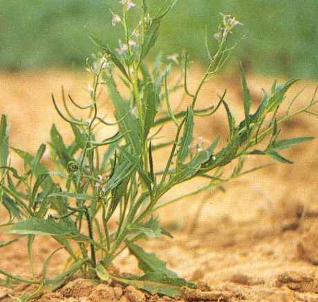 一年生草本,高8~35厘米,有单毛和分叉状硬毛。茎多分枝,有棱角。叶矩圆形,长1.5~8厘米,宽5~18毫米,先端圆钝,基部楔形,边缘有波状齿;叶柄长3~5毫米,上部叶无柄。总状花序顶生;花梗极短;花粉红色或蓝紫色,直径5~6毫米。长角果细长,近4棱,长4~7厘米,宽1~2毫米,倾斜,直立或稍弯曲,有单毛和分叉毛,有短喙。种子1行,多数,椭圆形,淡褐色。7~9月采收成熟果实,晒干,打下种子,除去杂质。