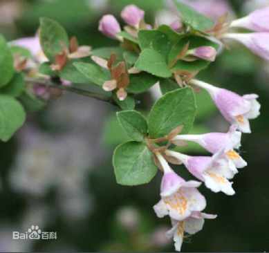 灌木,高达2米,幼枝有短柔毛。叶对生,卵形、椭圆状卵形或椭圆状披针形,长5~8厘米,先端尖锐或渐尖,基部楔形,边缘疏生小锯齿,绿色有光泽,背脉上疏生白色微毛;叶柄短或近于无。花数朵,腋生或顶生于短侧枝上;萼片2,长椭圆形;花冠玫瑰红色,5裂,直径1.5厘米,自下部至中部为筒状,上部喇叭状,基部一侧膨大;雄蕊4,2强;子房下位,3室,花柱伸长。瘦果具1种子,顶部有膨大的宿存萼片。花期6~7月。