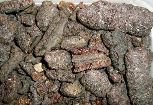 【药材】呈半圆柱状,长短宽狭不一,长3~10厘米,宽1~1.5厘米。紫褐色或紫红色,表面凹凸不平,有皱纹及小虫眼孔隙,附着于树枝处呈凹沟状,边缘钝圆。质硬而脆,可折断。断面有平行排列的长圆形或圆形虫窝,内有长卵形或圆形虫尸,褐色或暗红色。气微臭,味淡。遇热则软化而粘,以块大、色紫、质坚者为佳。