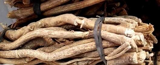 【药材】干燥根为长圆柱形,外表土黄色或土红色,有纵皱纹,并有稀疏支根与支根的断痕。断面纤维性,有丝状物,外围为棕色,中心为淡黄色。