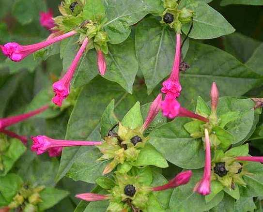 【药理作用】紫茉莉叶或全草的水提取物(用乙醇沉淀后)1g生药/ml至0.005ml可使离体兔心的心振幅很快增大,心率加速,但很快即完全恢复。0.01ml/kg予猫注射,可引起血压迅速上升75%,随即恢复。在水浴中当浓度为0.013ml(药液)/ml(营养液)时,对豚鼠离体回肠无影响,0.002ml/ml对兔十二指肠的收缩幅度及张力均表现抑制。水提取物中无生物碱反应,纸层分析认为存在儿茶酚胺,此成分可能为产生上述药理作用的有效物质。植物中曾分离出生物碱--胡芦巴碱。叶浸剂有利尿作用,可用于水肿,此植物有致泻作用(主要由于树脂成分所致),儿童吃其果实,可引起吐泻。