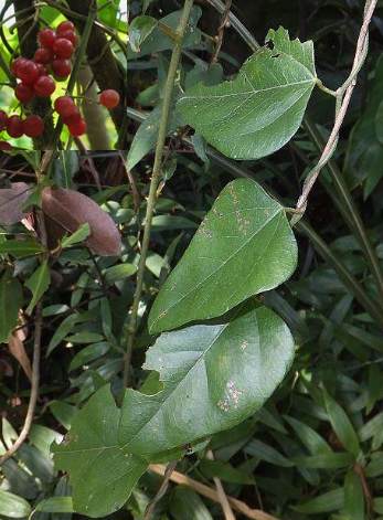 攀援木质藤本,长10余米。茎圆柱形,幼时绿色,被黄色柔毛,老时褐色,无毛,外皮稍粗糙,常有疣状突起;单叶互生,卵状三角形至三角形,长约10厘米,宽约6厘米,先端渐尖,基部心形;叶柄长2.5~3.5厘米,被绒毛或柔毛。雄花序2~4个簇生,长达8厘米,被疏柔毛;雄花外轮萼片3,内轮萼片6;花瓣6,雄蕊6;雌花有退化雄蕊,柱头顶端2裂。核果近球形。全年可采。