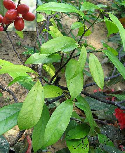 灌木,高1~4米。根通常单一,少分枝。茎枝褐黑色,有疏毛。叶革质,互生,长圆形或长圆状披针形,长9~18厘米,宽2~6厘米,先端渐尖,基部阔急尖;侧脉8~10对,下面凸起,顶端弯拱而连结;具短柄。花白色,单生,与叶对生,径1~2厘米;萼片三角形,急尖,被柔毛;花瓣长圆状椭圆形,内外轮花瓣等长或内轮的略短,广展,外面被紧贴的柔毛;雄蕊多数;心皮约7枚或缺如,被毛,柱头倒卵状,微2裂。果实卵形,径1厘米,熟时橙红色。花期4~7月。果期7~12月。全年可采,洗净,切片,晒干。