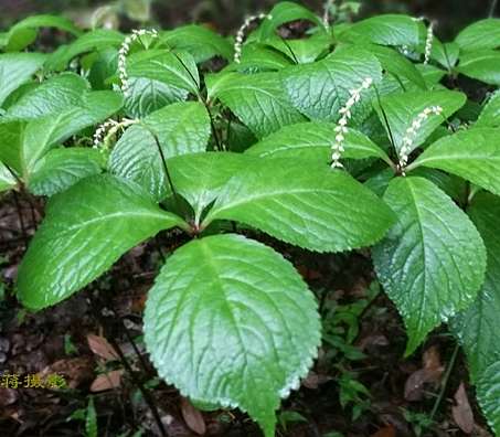 多年生草本,高约30厘米。根茎横走,生多数须根,有特殊香气。茎直立,不分枝,下部带紫色,无毛,节膨大,每节上生2枚鳞片状小叶。顶生叶4片,形大,排成轮状;叶片椭圆形,长约9厘米,宽约5厘米,先端渐尖,基部宽楔形,边缘有锯齿,脉纹明显;叶柄长约1厘米。穗状花序顶生;苞片不裂;花小,黄绿色,无花被;雄蕊药隔先端3裂,延伸成线形,长约1厘米。核果倒卵形,热时绿色。花期夏季。全草,夏、秋采收。根,秋季采挖,洗净,晒干。