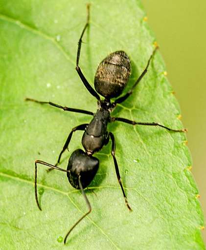 工蚁体长约1s毫米。体漆黑色,平滑有光泽。头圆三角形,复眼1对,椭圆形;单眼3个,品字排列。触角1对,屈膝状,共12节,柄节最长。口器发达;咀嚼式。前胸背板甚发达,中胸背板较小。无翅。足3对,发育相等。胸部和腹部相接处缩小呈细柄状,并具有向上的鳞片1枚;腹部5节。上颚、触角、足为睹褐色;头胸、足及每腹节的后缘有褐色硬毛,腹节后缘的毛较密,其余的较稀。兵蚁与工蚁相似。雌蚁形大。雄蚁较雌蚁略小,均有翅,其触角细长,不呈屈膝状。幼虫头胸部细小,腹部较宽,体黄白色,无足;蛹白色。营群体生活,常筑巢于地下。