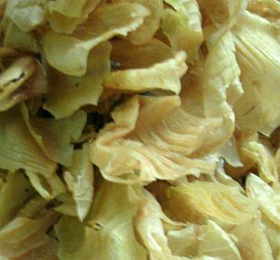 【药材】干燥的鹅内金,为圆片状或破碎的块片,直径约3厘米,厚约1毫米,表面黄白色或灰黄色,平滑,无光泽,边缘略向内卷,边上有齿状短裂纹。质坚而脆。气腥。