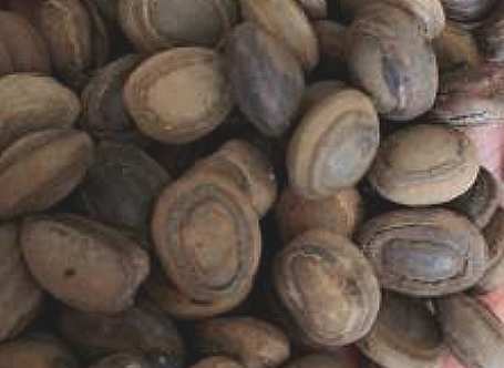 【药材】呈椭圆形,略侧、枣,大小相差悬殊,大者如鸡卵,小者仅如黄豆,一般如莲子大。表面青铜色或绿黑色,平滑而有光泽。质硬而脆,击之易碎;断面灰黄色,有层次,中央有核。气微香,味微苦涩,嚼之有砂性。以个大、色深、质脆者为佳。