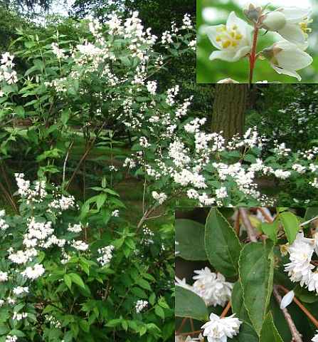 落叶灌木,高达2米。小枝中空,赤褐色,幼时有星状毛,老时则光滑成薄片状剥落,芽具多数覆瓦状鳞片,无毛。叶对生;有短柄;叶片卵形至卵状披针形,长5~12厘米,宽2~4厘米,先端尖以至钝渐尖,基部稍圆,边缘具小齿;两面有星状毛,背面的星状毛有10~15辐射枝。圆锥花序直立,长2.5~10厘米,花白色或外面有粉红色斑点,长1.2~1.8厘米:萼杯形,有5齿,裂片三角形,早落;花瓣5,长圆形,外面被有星状毛;雄蕊10,较长的花丝与花瓣等长,花丝先端具牙齿;花柱通常3枚,离生。蒴果近球形,顶端扁平,径4~5毫米,有多数细小种子。花期5~6月。