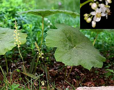 多年生草本,高达50厘米。根茎横生,粗壮,具一列凹窝,着生多数须根。基生叶1枚,大,阔肾形,2深裂,有长柄,盾状;茎生叶2片互生,与基生叶同形,但较小,边缘具牙齿及小缺刻。花白色,为顶生聚伞花序,有长总梗;萼片6,早落;花瓣、雄蕊均6枚;子房上位,由1心皮组成;胚珠5~6颗。浆果球形,长约10毫米,蓝黑色;有种子数枚。秋季采挖。