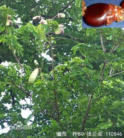 乔木,高可达40米。树皮灰褐色,有灰白大斑点,粗糙。小枝带圆形,黄褐色。叶双数羽状复叶;叶柄短;总柄细;小叶2~4对,先端微凹,或钝形,基部卵圆形,全缘,纸质,上面深绿色,下面灰绿色,长7~8厘米,宽5~6厘米,侧脉弧形,网脉疏生。总状花序排成顶生圆锥状,花在序轴上几偏向于一侧;萼管状,4裂,裂片长圆形;花瓣只有1枚发育,其余退化,淡紫色;雄蕊7,突出,顶端略曲,有药者4枚,退化者3枚,药呈褐色;雌蕊1,较雄蕊略长,子房上位;1室。荚果木质,矩圆形,长10~12厘米,宽6~7厘米,厚4厘米,中部微缢,棕褐色而光滑,密布黄色斑点,边缘尤甚,全体有多数小突起。种子通常2~3颗,扁圆,有角质的假种皮状种柄。花期5月。果期8月。