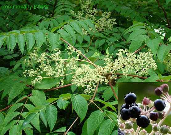 落叶灌木或乔木,高达8米。茎直立,通常具针刺。2回或3回单数羽状复叶,长40~80厘米,羽片有小叶5~11,基部另有小叶1对,卵形至广卵形,长5~12厘米或更长,宽3~8厘米,先端尖或渐尖,边缘细锯齿,基部不甚对称,圆形或心脏形,上面粗糙,下面绒毛状,沿脉上密被淡褐色细长毛。花序大,圆锥状,由多数小伞形花序组成,长达50厘米,密被褐色短毛;花梗细,有毛,墓基有膜质披针形小苞片;花萼钟状,先端5齿裂;花瓣5,白色,三角状卵形;雄蕊5;子房下位,5室,花柱5,离生。浆果状核果,近球形。具5棱,花柱宿存,熟时紫黑色。花期7~8月。果期9~10月。全年可采。