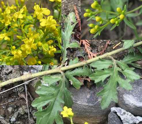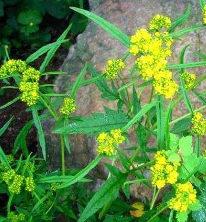 ②糙叶败酱:多年生草本,高20~40厘米。茎丛生,茎上部多分枝,分枝处有节纹。叶对生;革质,羽状分裂,裂片倒披针形、狭披针形或长圆形,有牙齿,顶端裂片较侧裂片略大,叶缘及叶面被毛。聚伞花序顶生,呈伞房状排列;花轴及花梗上生细毛;苞片狭窄,寓生;花小,黄色,花冠合瓣,5裂;雄蕊4;子房3室,柱头头状。果实翅状,卵形或近圆形,扁薄如纸,直径约6毫米,有网纹,种子位于中央。