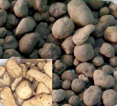 【药材】干燥的菌核为球形或不规则的圆块状,大小不等,直径1~2厘米。表面呈紫褐色或灰褐色,全体有稍隆起的网状皱纹。质坚实而重,不易破裂;击开后断面不平坦,粉白色或淡灰黄色,呈颗粒状或粉质。质紧密者为半透明状,可见有半透明与不透明部分交错成纹理。气无,味淡,嚼之初有颗粒样感觉,微带粘液性,久嚼则溶化而无残渣。以个大、饱满、质坚、外紫褐色、内白色、无泥沙者为佳。