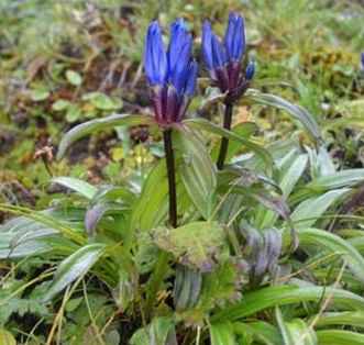 矮小草本,高约4厘米。茎单生或数茎丛生。叶对生,无柄,密集,全缘;基生叶数枚,阔卵形或卵状椭圆形,长12~15毫米,宽11~12毫米,先端渐尖,顶处尾尖。基部钝圆;茎生叶倒披针形至倒卵状披针形。长7~10毫米,宽3~7毫米,下部的叶较大,先端尾尖,基部渐狭抱茎,叶缘膜质,白色。花1~2朵顶生;花冠蓝色,钟状,长约12毫米,5裂,裂片卵状三角形,褶处有1齿状附属体,几与裂片等大。蒴果,膜裂为2果瓣。种子多数,表面浅棕色。秋、冬采收,洗净晒干。