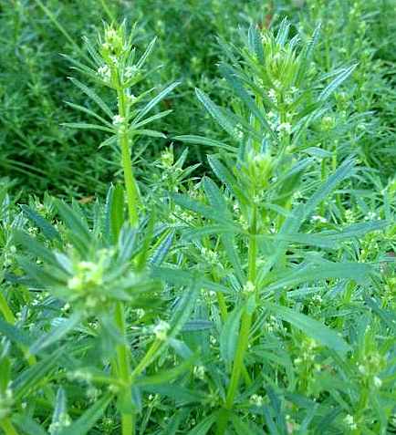一年生草本,高20~80厘米。偃卧或稍斜举。根为多数须根。茎4棱,具分枝,棱上有倒刺。叶4~8片轮生,膜质,无柄,长圆形,先端钝圆,具针状尖头,基部楔形,全缘。聚伞花序腋生,花小,花瓣4,淡绿色。6~8月采收。洗净,切段,晒干。