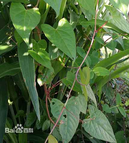 多年生缠绕草本,长3~8米。块根肥大,直径可达10~20厘米,横切面酱红色。茎绿色至淡紫绿色,光滑无毛,有紫色斑点。叶互生,宽卵形成卵圆状三角形,长4~10厘米,宽3~6厘米,先端尖,基部截形至浅心形,两面近于无毛,上面有紫斑纹或无;叶鞘干虞质,叶柄长2~4厘米。花小,白色;总状花序腋生咸顶生。瘦果卵形,包被于宿存花被内,具3棱。秋季采挖。切片晒干。
