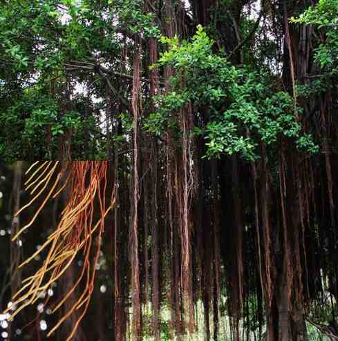常绿大乔木,高20~25米,胸径达2米以上,干多分枝扩散;树冠扩大成伞状;树皮不剥落,具白乳汁;由干抽出气根,可垂及地,挺直如柱。叶互生,革质,阔倒卵形或倒卵状长圆形,长4~10厘米,宽2~5.5厘米,基部楔形或圆形,先端钝、短渐尖,全缘,两面均无毛,侧脉5~6对,表面不明显;叶柄长7~15毫米.隐头花序单生或双生于叶腋内,倒卵球形,直径约5~10毫米,初乳白色,熟时黄色或淡红色,基部苞片3,阔卵形,钝;雄花花被3~4,雄蕊1;雌花花被片3,柱头长;瘿花似雌花。花期5~6月。果期9~10月。割下气根,扎成小把,晒干。