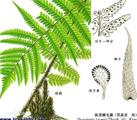 【来源】为鳞毛蕨科植物狭顶鳞毛蕨的根茎及叶。