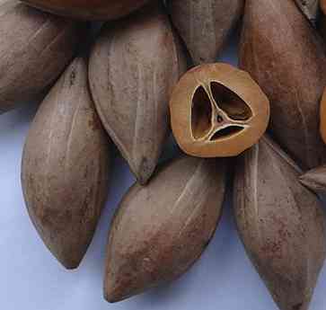 【药材】果核呈梭形,两头钝尖,红棕色,上有6条棱线,质坚硬,不易碎;剖开内有3室,其中各有种子1粒。种子细长梭形。种皮棕红色,内为白色种仁,油性足。无臭。