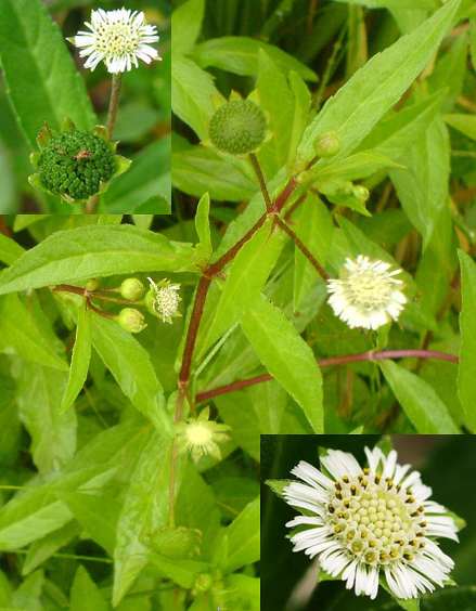 一年生草本。茎柔弱,直立或匍匐,高达30~60厘米,被毛。叶对生,近无柄,线状矩圆形至披针形,长4~10厘米,宽0.8~2厘米,基部楔形,先端短尖或钝,全缘或稍具齿,叶两面密被白色租毛。头状花序,腋生或顶生,具花梗;总苞绿色,卵形至阔钟形,苞片少数,2列,被小粗毛;花托扁平,有线状鳞片,托上着生少数舌状花及多数管状花;舌状花雌性,约2列,狭线形,发育或不发育,白色,全缘或为2齿裂,子房椭圆形而扁,管状花两性,全发育;花冠4浅裂,裂片卵形,外被疏毛,雄蕊4,药围绕花柱四周;子房椭圆形而扁,花柱柱状,柱头2裂。瘦果黄黑色,长椭圆形而扁,长约3毫米,顶端秃净。揉搓其茎叶有黑色汁液流出。花期夏季。果期9~10月。夏、秋季割取全草,除净泥沙,晒干或阴干。