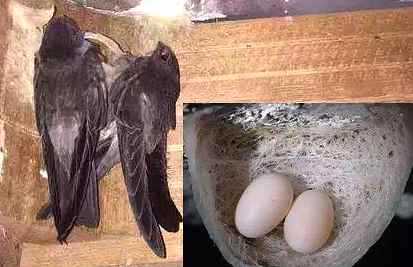 金丝燕:体长约9厘米。嘴暗褐色,形短,稍带弯曲,基部宽阔。背褐黑色,略有光泽;腰部较淡;腹部灰白戌赤褐色。翅长而尖,合翅时,翼端远超过尾端;尾短,尾羽略呈方形。脚极细弱,4趾均向前。多见于热带沿海地区,在岛屿险峻的岩洞深暗处筑巢聚居。飞翔力很强,不善行走。食物为各种飞虫。分布东南亚一带及太平洋各岛屿上。