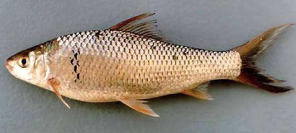 体长、侧扁,腹部圆,背部在背鳍前方稍隆起。体长约30厘米。头短,吻圆钝,吻长略大于眼径。眼侧位,眼间距宽。口下位,较小,呈弧形,上下颌角质化。须2对,吻须较明显,颌须短小。唇的边缘有多数小乳状突起,上唇边缘呈细波形,唇后沟中断。下咽齿3行。鳞中等大,侧线鳞38~41。背鳍Ⅲ12,无硬刺,其起点至尾基的距离大于至吻端的距离。臀鳍Ⅲ5。尾鳍分叉深。体上部青灰色,腹部银白,体侧在胸鳍基的后上方,有8~9个鳞片的基部具黑色斑块。幼鱼尾鳞基部有一黑色斑点。