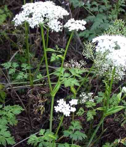 多年生草本,高15~60厘米。根茎短。茎直立,通常单一,中空,表面具纵棱,常带紫色。基生叶在花期时雕落;茎生叶互生,在下部和中部的叶有长柄;叶片全形为广三角形,通常为3回3出羽状全裂,最终裂片卵形或广卵形,先端短渐尖,基部楔形,或近圆形,边缘有少数缺刻状牙齿,上面绿色,沿脉有细微的乳头突起,下面灰绿色;茎上部的叶较小,叶柄鞘状,2回3出羽状全裂。复伞形花序顶生;总苞片少数,早落;伞梗6~19个;小总苞片锥形,10枚左右,花梗20左右;萼齿不明显;花瓣5,白色,椭圆形;雄蕊5,较花瓣长,花药黑紫色;子房下位,花柱呈压扁的圆锥形。双悬果椭圆形,分果具5条果棱,果棱具狭翅,背棱棱槽中有油管1个,侧棱棱槽中有油管1~2个,合生面有油管2~4个。花期7~9月。果期9~10月。