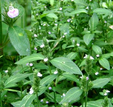 一年生匍匐草本,高15~30厘米。茎方形,或具4~6梭,绿色,表面被灰白色细柔毛,尤以棱上较密,节稍膨大。叶对生;卵形、长椭圆形或广披针形,全缘,先端尖,上面暗绿色,下面淡绿色,两面均有短柔毛;叶柄长5~10毫米。穗状花序顶生或腋生,长约2.5厘米;花小,萼片5,线状披针形或线形,边缘呈白色薄膜状,外围有苞片2枚,形状与萼同;花冠淡红色或带紫红色,较萼略长,上部唇形,上唇先瑞2浅裂,下唇先端3裂较深;雄蕊2枚着生于花筒部,花丝基部及着生处四周有细绒毛,药2室,1室不孕,并呈距状而下垂;雌蕊1,有毛,子房卵形,2室,花柱丝状,柱头头状,不明显。蒴果线形,先端短尖,基部惭狭,全体呈压扁状,淡棕色,表面上部具有白色短柔毛。种子卵圆形而微扁,径约1毫米,黑褐色,表面具有网状纹凸起。花期8~11月。立秋后采收,晒干。