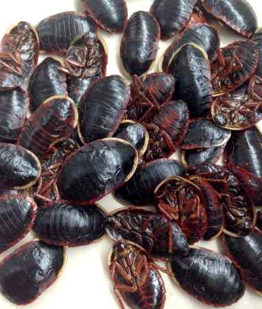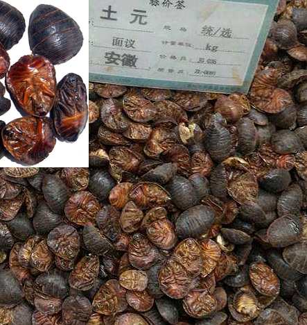 为昆虫地鳖的干燥雌虫。呈卵圆形而扁平,长2~3厘米,宽1~2厘米。头部一端较窄;尾部较宽;背面紫黑色,呈甲壳状,为9个横节覆瓦状排列而成。腹面深棕色,有光泽,可见小形的头部,棕黑色;触角1对,多已脱落。脚部足3对,弯曲,腹部隆起,有弯曲的节,尾节较宽而略尖。质松脆,易破碎,腹内有灰黑色物质,气腥臭,味微咸。以完整、油润光泽,无泥者为佳。