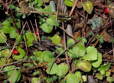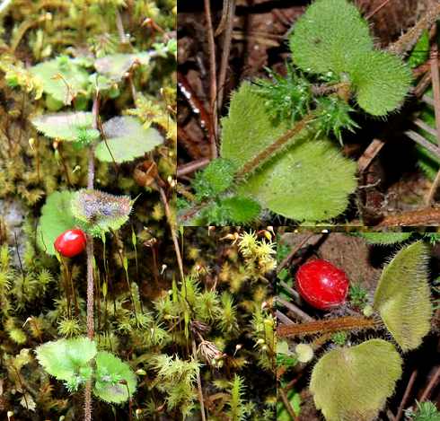 匍匐状小草本。茎下部纤细,横走,皮黄褐色,有多数短枝及不定根;茎上部黄绿色,有绒毛。叶两型,茎上部的叶对生,圆心形或肾形,长1~1.5厘米,宽1.5~2厘米,边缘有钝齿,两面均疏生白色柔毛;簇生于短枝顶端的叶呈针状,长2~5毫米。花单生于针状叶的叶腋,玫瑰红色;萼5深裂,被毛;花冠管短;子房上位。果肉质,卵状,亮红色,熟后膜裂;内有种子多数,椭圆形,有网纹。夏、秋采收,晒干。