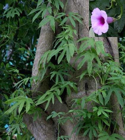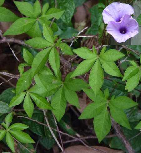 多年生藤本。根粗壮,近肉质。单叶互生,叶片轮廓圆形或肾形,宽7~15厘米,指状5~7深裂,裂口狭而基部挥圆,裂片通常披针形。聚伞花序腋生,花序柄与叶柄等长或更长,花3~5朵或更多;萼片阔卵形,钝头,长达1厘米;花冠粉红色或红紫色,阔钟状,基部有一短管,长5~6厘米;雄蕊5,内藏;子房上位,花柱合生,蒴果卵形,长1厘米左右,4室,4瓣裂;种子被长绵毛。花期夏、秋季。全年可采。根洗净、切片、晒干;叶鲜用。