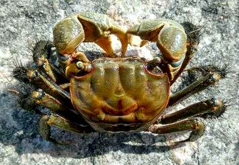 全体被坚硬的甲壳。头胸甲长约3.8厘米,宽约4.4厘米;四方形。额宽大,大于头胸甲宽度的1/2,前缘中部有较宽的凹陷,额后部有4个并立的突起。眼具短柄,能活动;外眼窝齿呈三角形,背眼窝缘光滑,甚凹陷。侧缘具光滑隆线,无齿。螯足1对,长节背缘近末端处具一刺;掌节外侧面具鳞形颗粒,背缘具1条颗粒隆线。步足4对,密具长短不等的硬刚毛。腹部退化,雌雄异形,雄者呈三角形,雌者圆形。