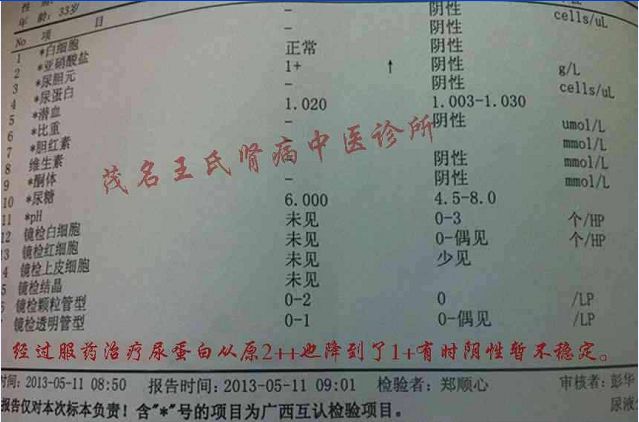 2011年后复查肾功能提示损伤加重了,血肌酐又升高,最高时达到186 umol/L,尿素又下降点7.3 mmol/L,尿蛋白2+。说明肾功能损伤又进一步扩大。患者好担心病情发展过快,自己还未结婚。。。。一想头就疼,又在网上搜索治疗方面资料,无意又看到茂名市王氏中医肾病诊堂专业是治疗肾脏病,看介绍比较给人相信真实,这次患者刚好出差在广州,办完事第二天坐火车回广西时路经过茂名市,就联系王大夫,预约明天下午回到茂名来诊堂面诊。