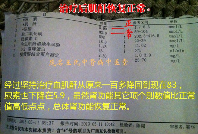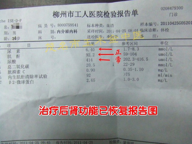 患者一直都按时服药,到服了3个疗程中药后,尿量大增,尿颜色比之前清晰,原来全身乏力症状消失了,全身乏困也没有感觉到了,特别是胃口比之前好,饭量大、精神好,睡眠也好多了;2011年4月25日医院检查报告显示:肌酐降回92.2 umol/L,尿素6.4 umol/L,尿酸:414 umol/L。尿常规:蛋白尿:阴性,从指标看肾功能恢复快正常了,尿蛋白阴性也说明肾脏炎症消除。