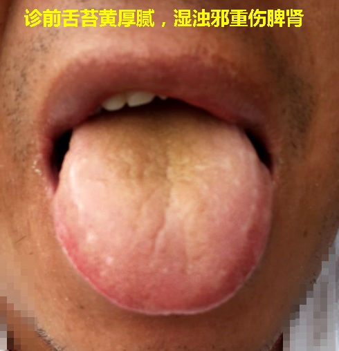开始诊治:患者亲自前来诊堂诊治,患者体重80公斤,偏肥;血压高110/160左右;症状:劳累过度或熬夜时眼皮会出现水肿,双下肢无水肿,无腹水。容易患感冒和咽喉炎。最近,身体感觉乏累,精神不振,睡眠不好,面色萎黄、容易出大汗、时有腰痛、才足欠温,口干。小便色黄,尿频,夜尿2~3次。大便多偏干不畅,每1~2天排便一次。患者舌体肥大,舌质偏红,舌苔厚黄腻。上个月检查尿常规检查:蛋白(++),血尿(+),红细胞少量,其它项正常。2010年11月12日,诊前肾功能检查报告提示:血肌酐:186 umol/L几,尿素氮:7 .3mmol/L,尿酸632 umol/L。