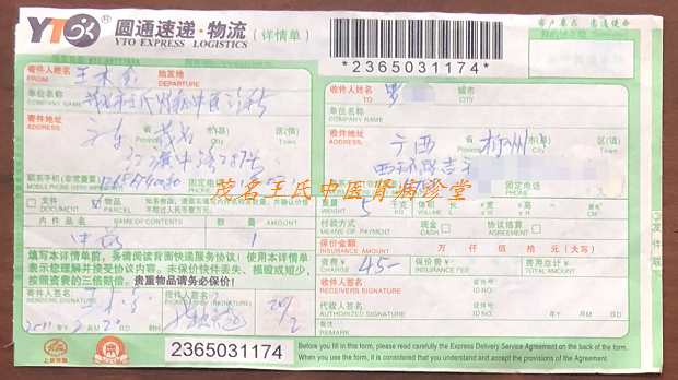 患者与王大夫详谈了一下午后决定治疗,当天晚就配好一疗程草药及用药说明书一并给带回,患者当天晚上坐下半夜班坐火车回广西柳州。