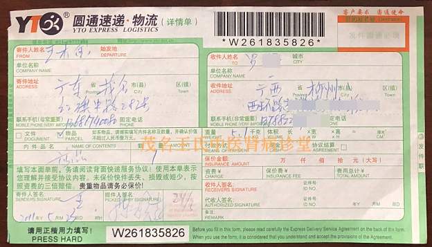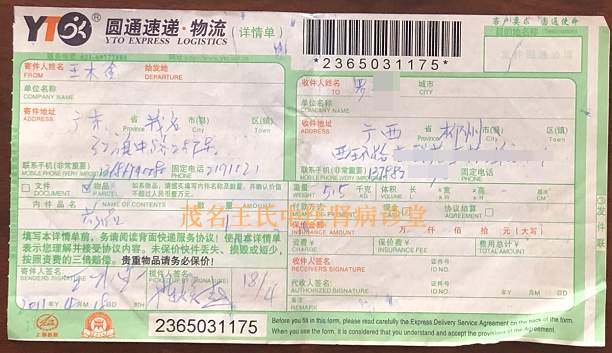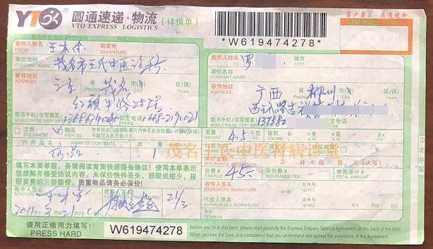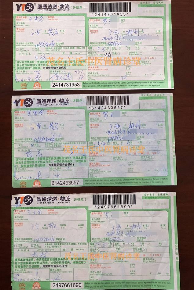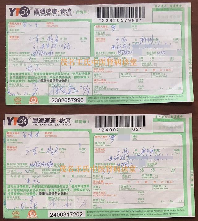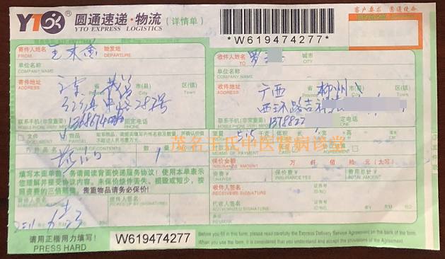 下面是患者当年治疗的每个疗程用药.邮药快递单图: