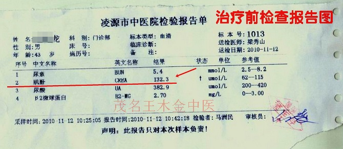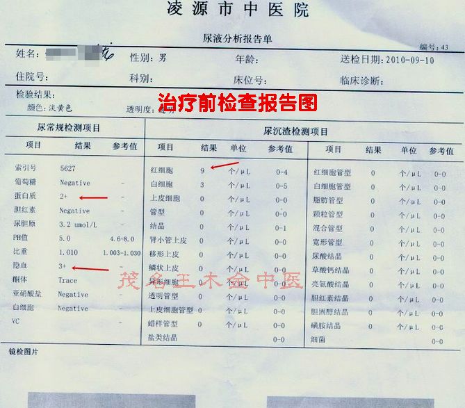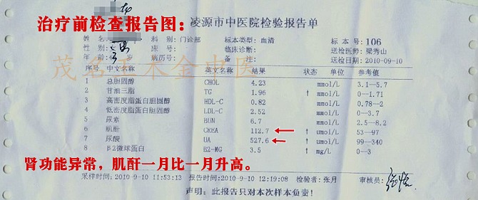 【患者病史】患者于2007年8月体检发现尿蛋白与血尿,诊断为慢性肾炎,患者得病前二年来在本地各大小医院拿点中成药治疗,久不久服服,效果不理想,一直尿检蛋白尿(++~+++),血尿(+~++)波动,(附:发来诊前报告单,看下面),那时自身无什么症状出现,认为自己病情轻,所以,一直带病工作,平时饮食也不注意忌口。再后来到了3年过后复检查肾功能检查提示见有损伤,血肌酐升高了,有一次血肌酐高达上升高到170umol/L了;肾功能出现减退,此时才发觉病情严重了,后悔前三年不重视好好用药治疗,造成今天结果,好多肾炎患者也是因治疗不当走上尿毒症后期,最终靠透析维持,越想越担心。