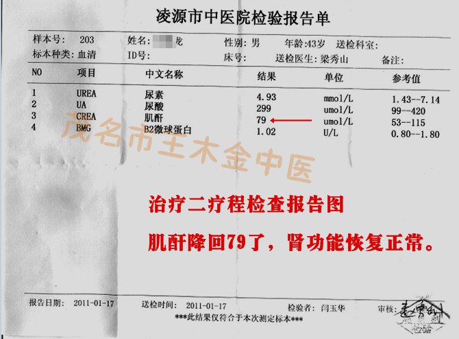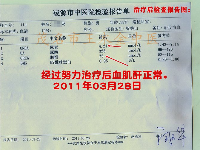 患者见到吃药效果好了,心情愉快,王大夫叮嘱患者不能放松治疗,患者也比较听话知道病情才刚刚开始恢复中,还要按时服药,注意忌口,平时又休养较好,所以病情恢复得快。患者继续用药治疗到2011年3月28日,当天自己到医院再次化验肾功能:这次检查结果是:肌酐:75 umoi/L,尿素氮:4.21 umoi/L,尿酸:323 U/L;结果提示肾功能比之前恢复得更加正常了,而且也经过二三个月不反弱,相对稳定了,尿常规也提示蛋白与血尿有所下降。