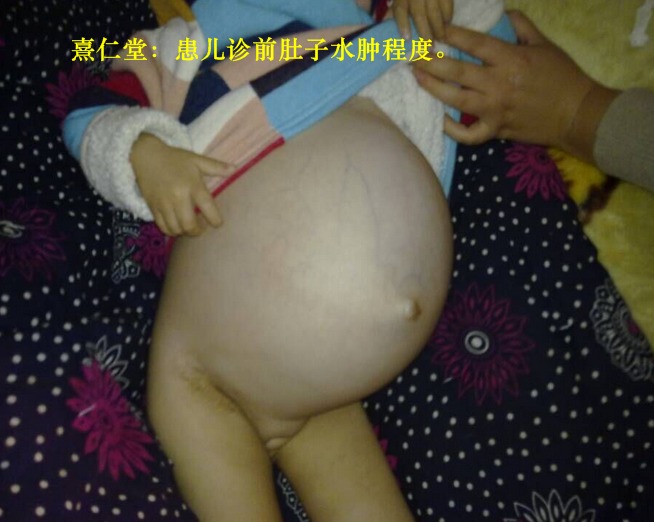 患儿坚持治疗中,到了八、九个疗程时间,身体状况越来越好,此时患儿全身水肿已完全消肿而且基本稳定了,大腹水肿也全消退了,再也看不到原来腹部大大肿胀样子了,现在患儿体现更有精神。