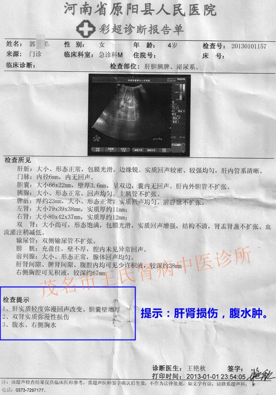 患儿:郭**,性别:女,年龄:4岁,地址:河南省新乡市原阳县。诊断:慢性肾病综合症、腹水肿、肝肾功能损伤。病史时间:2年。
