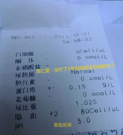 中草药治疗快1年时间尿蛋白进入弱阳性,潜血还不稳定。