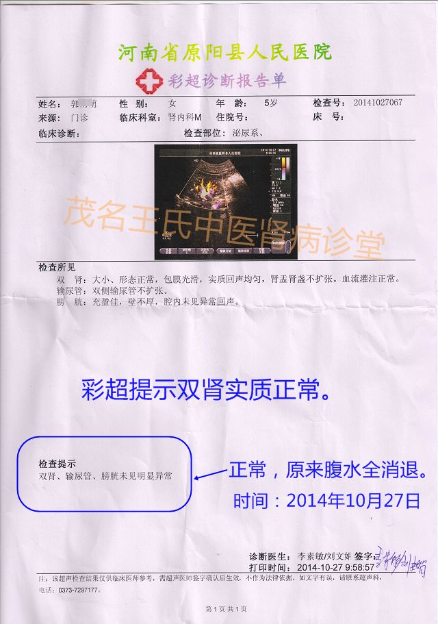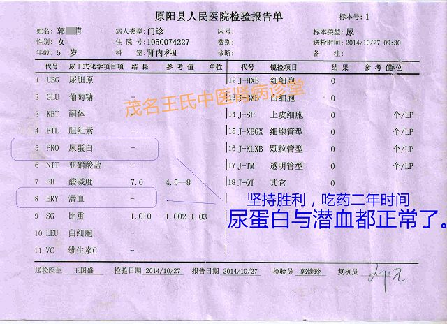 后面,患儿经过艰辛治疗,患儿尿蛋白转阴而且稳定,身体壮况也恢复很好,面色红润有气色,体力好,精神好,喜蹦跳,看患儿舌质,舌苔也恢复正常状态了,表明孩子的肾综痊愈了,王大夫建议带孩子去医院详细复检查,于是在2014年10月27日到医院做检查,报告结果出来,尿蛋白阴性(正常),尿潜血阴性(正常),肝肾功能也恢复正常指标了。彩超检查也提示正常了(原来提示有腹水、胸腔积液等)。患儿肾病综合症最终经过耐心治疗痊愈停药,后面孩子家长还不放心过快停药,再坚持吃点药维持,久不久还是让孩子再喝点药巩固,这个做法也是非常好,对以后也更加稳定。