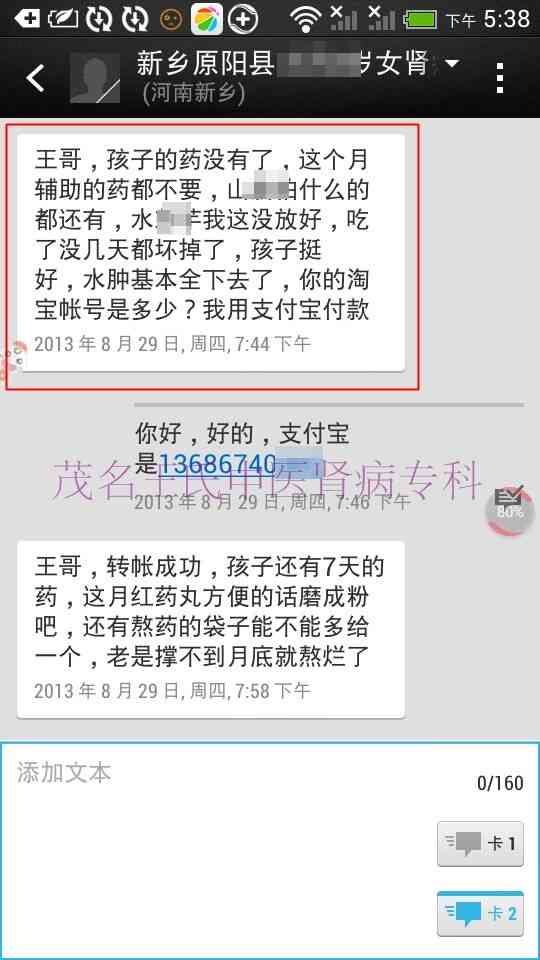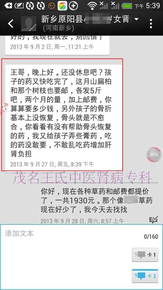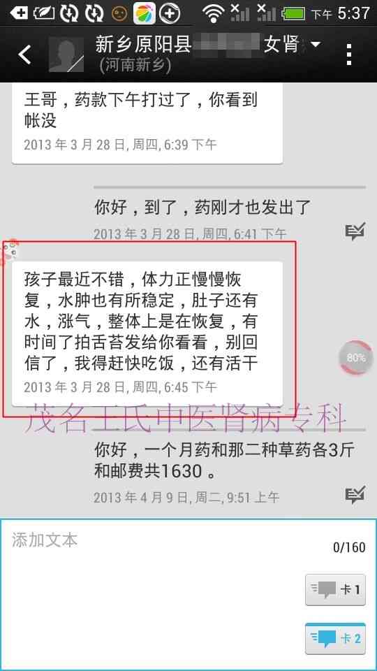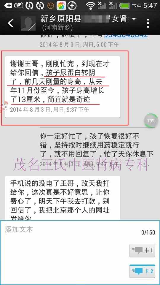 下面是王大夫与患儿父亲当时短信部分聊天截图: