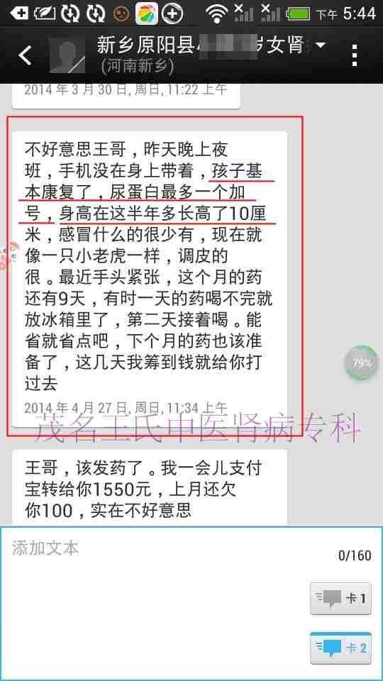 后面患儿父亲坚信一定有中草药可以治好小孩病,只是未遇到,于是开始上网寻找方法,也是在网上看到茂名市王氏中医肾病诊堂介绍,得知王大夫使用家传秘方山草药治好不少肾病患者,刚好孩子又是肾病引起肝损伤,病症合适,之前也没使用过山草药治疗,如果换山草药治疗可能还会有效果。于是加了王大夫QQ,同时将孩子的之前病历报告发送给王大夫,还拍患儿舌苔照发给王大夫进一步诊断。
