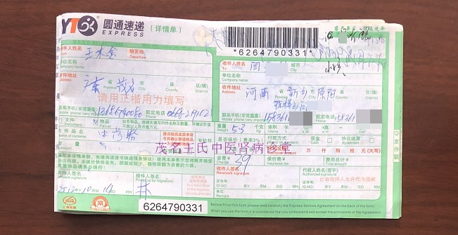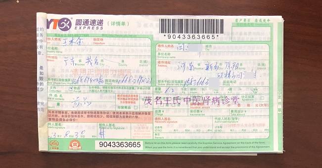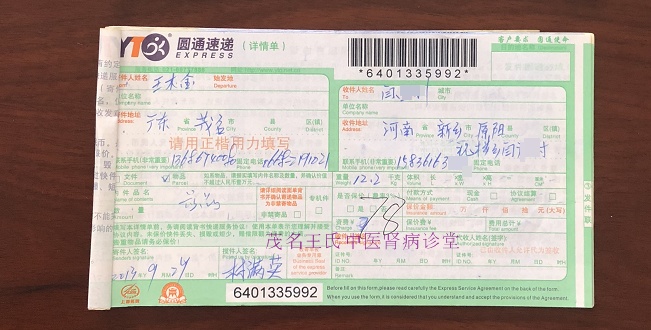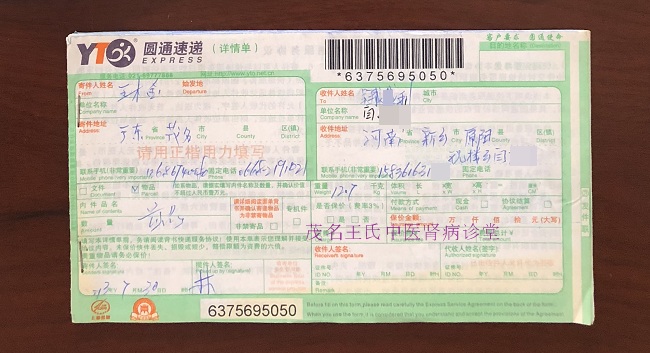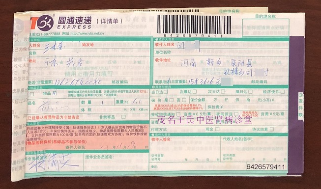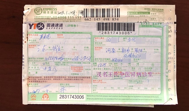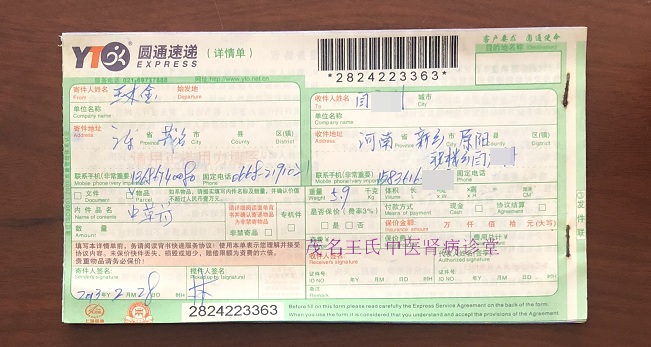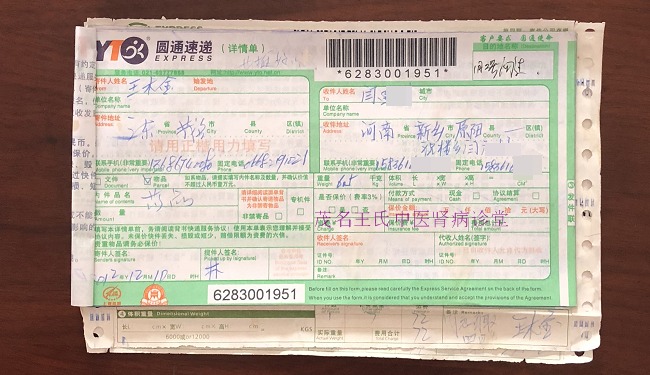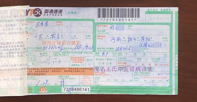 【邮药】由于患儿家在河南省新乡市原阳县,路途远,亲自过来诊实在不方便,加上患儿水肿重,更不适合坐长途车,如果中途有影响病情加重也不好处理,后通过邮药治疗,省时间省费用更利于治疗,王大夫将半个疗程山草药和药用说明书一同打包寄圆能快递,三天收到药物。